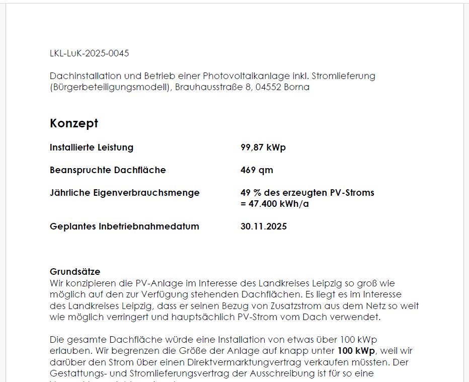 Nachdem das gesamte Verfahren aufgehoben wurde ist unklar ob und wann wir überhaupt eine Einigung für unser PV-Projekt in Borna erreichen. Wegen Formfehlern wertet das Landratsamt unser Angebot nicht Diese